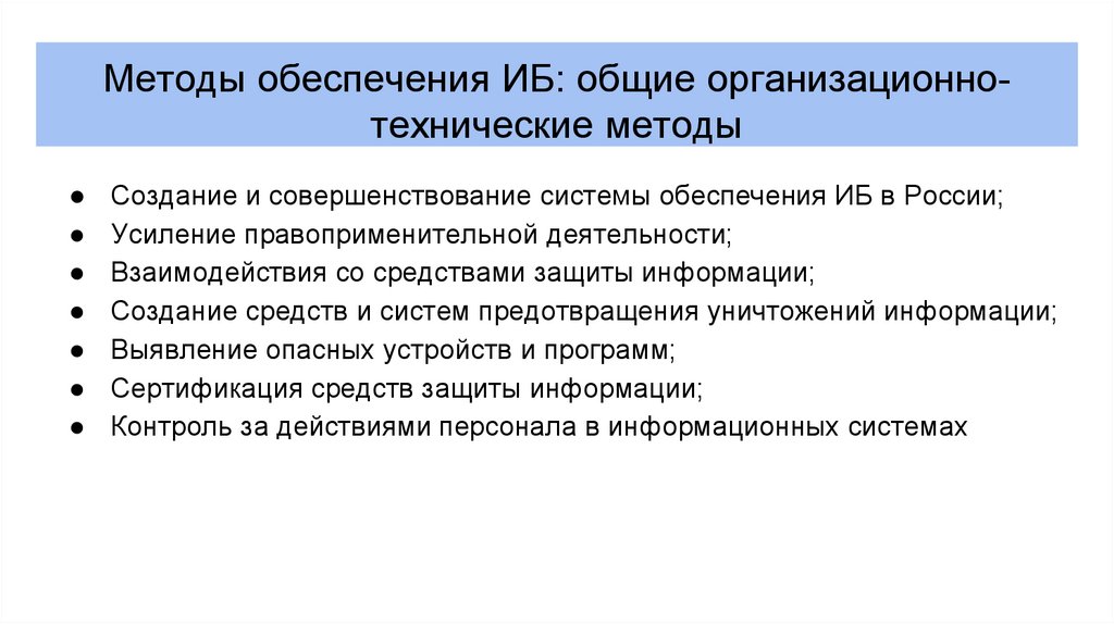 Методы обеспечения ИБ: общие организационнотехнические методыСоздание и совершенствование системы обеспечения ИБ в России;