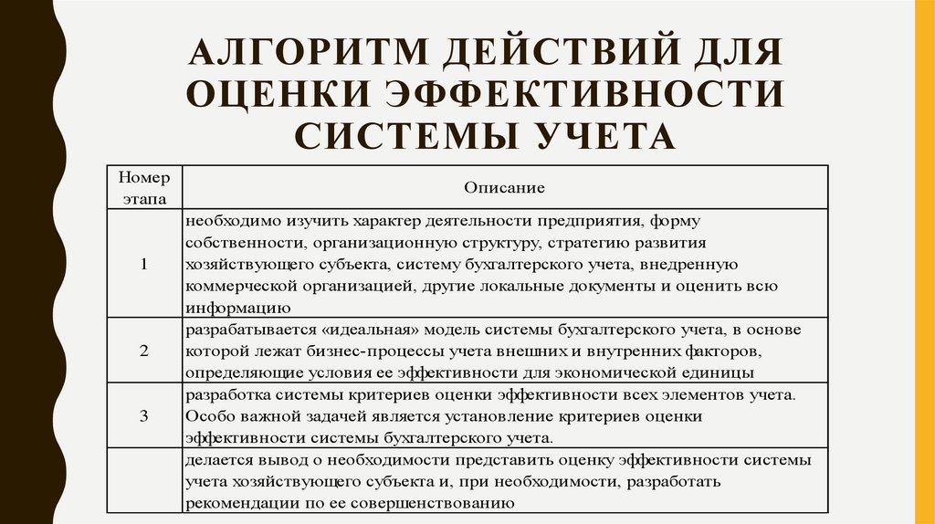разработка системы критериев оценки эффективности всех элементов учета.