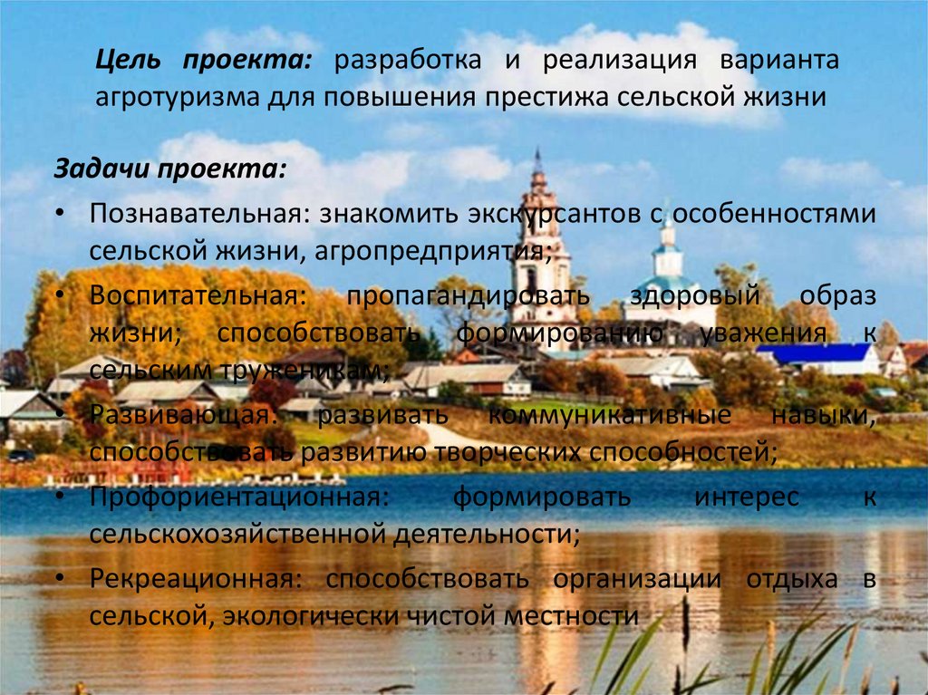 Цель проекта: разработка и реализация вариантаагротуризма для повышения престижа сельской жизни