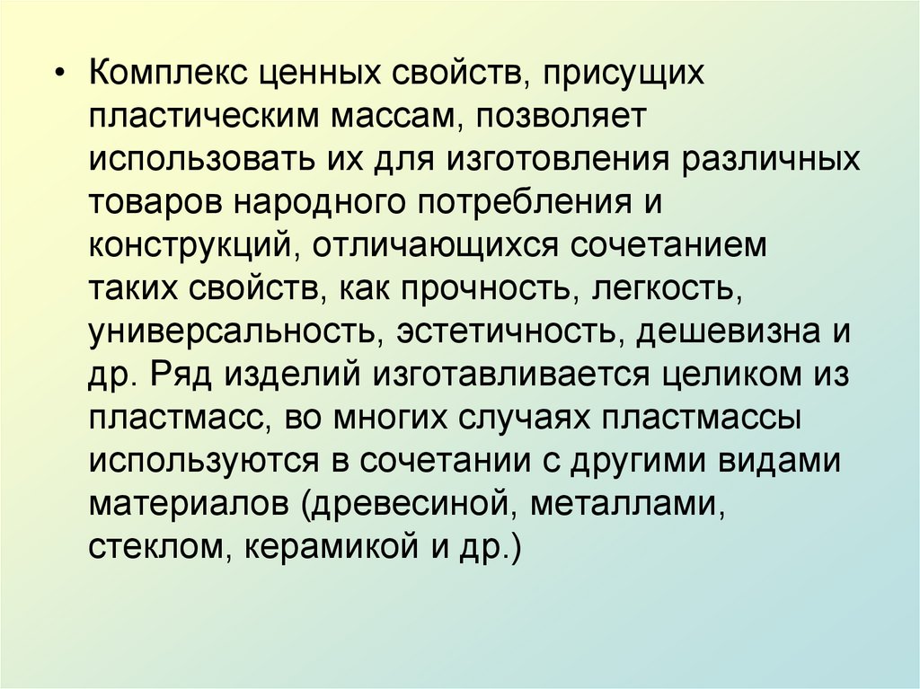 • Комплекс ценных свойств, присущихпластическим массам, позволяет