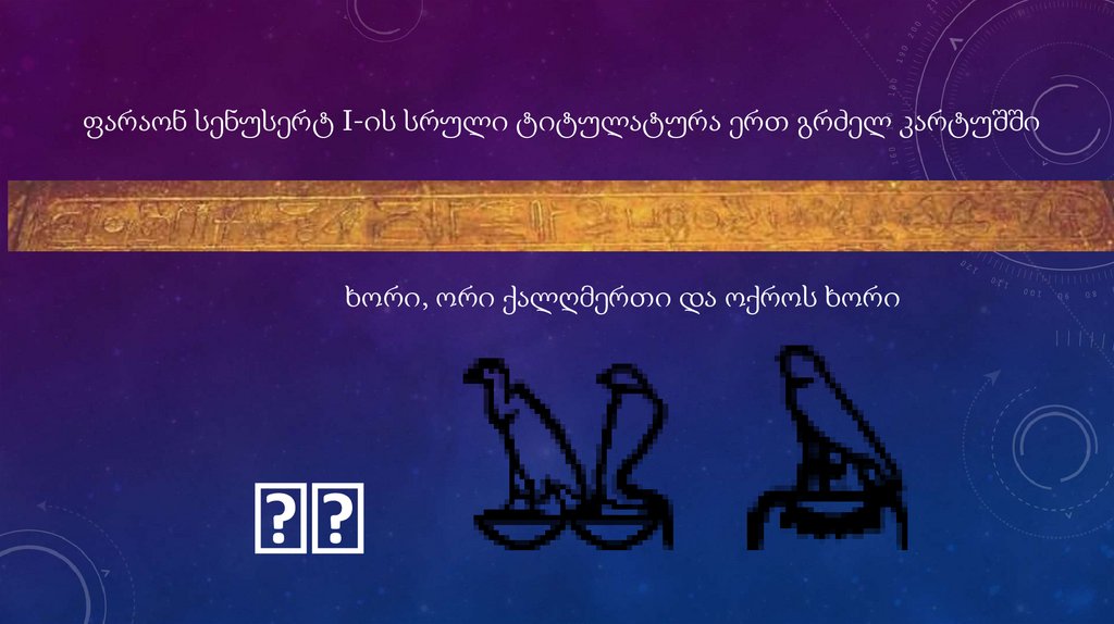 ფარაონ სენუსერტ I-ის სრული ტიტულატურა ერთ გრძელ კარტუშშიხორი, ორი ქალღმერთი და ოქროს ხორი