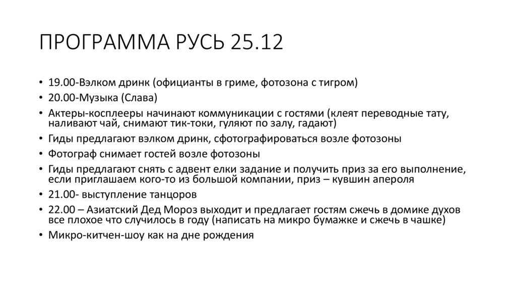 ПРОГРАММА РУСЬ 25.12• 19.00-Вэлком дринк (официанты в гриме, фотозона с тигром)