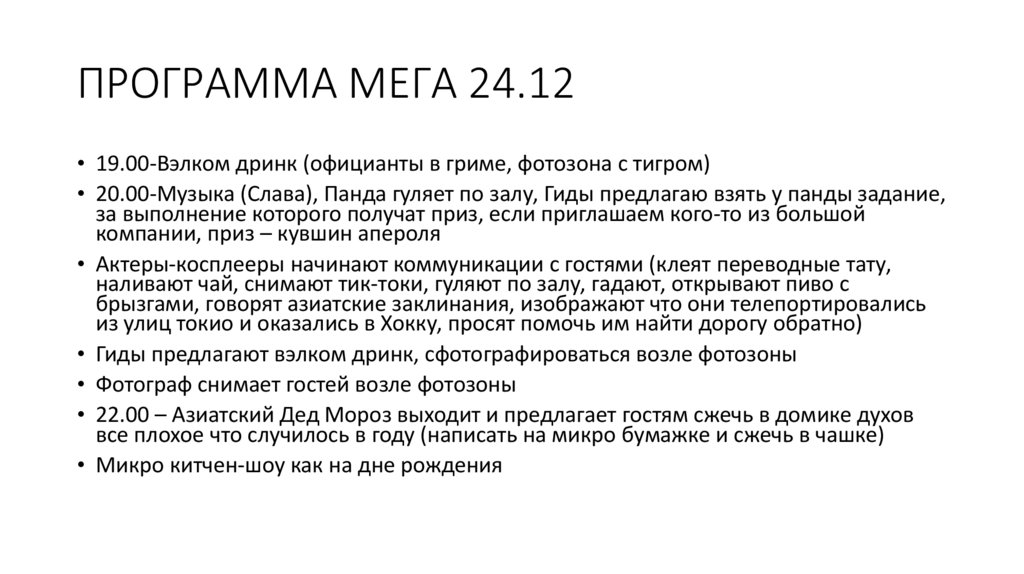 ПРОГРАММА МЕГА 24.12• 19.00-Вэлком дринк (официанты в гриме, фотозона с тигром)
