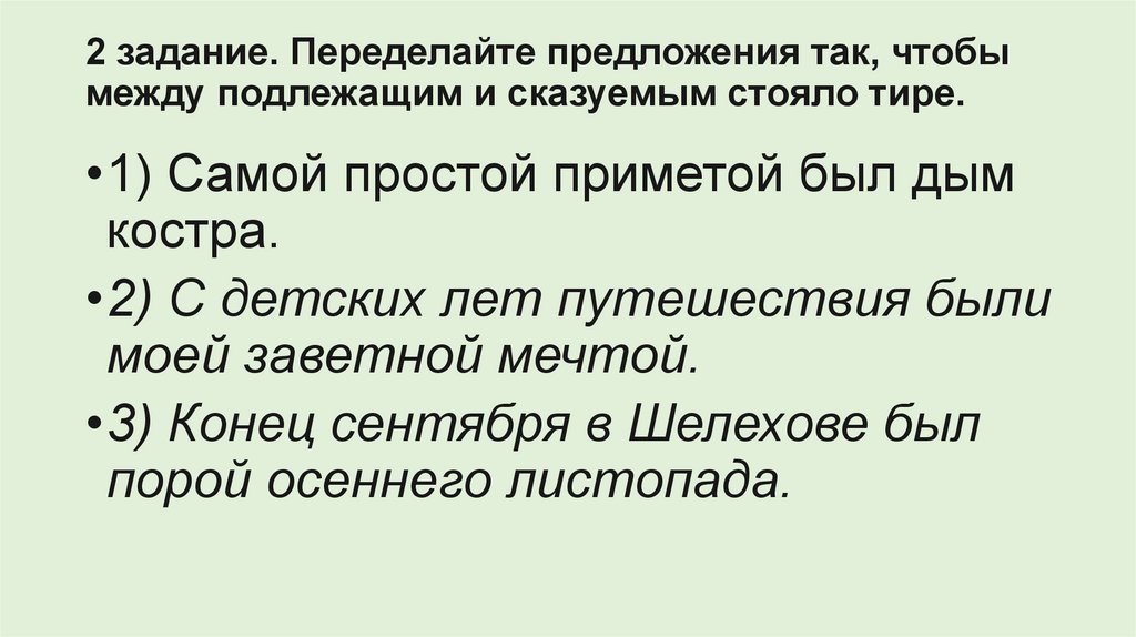 2 задание. Переделайте предложения так, чтобымежду подлежащим и сказуемым стояло тире.