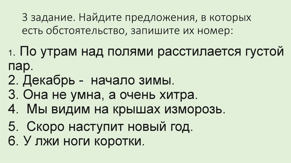 3 задание. Найдите предложения, в которыхесть обстоятельство, запишите их номер: