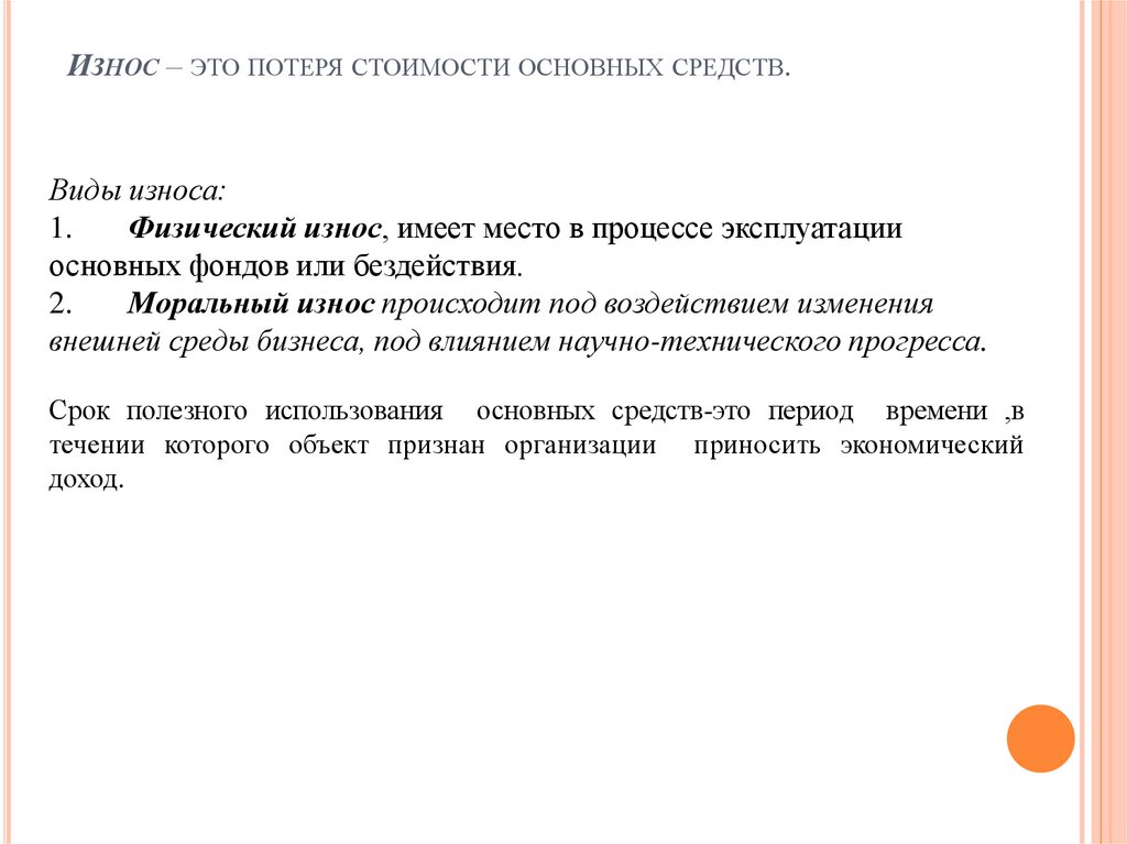 ИЗНОС – ЭТО ПОТЕРЯ СТОИМОСТИ ОСНОВНЫХ СРЕДСТВ.Виды износа: