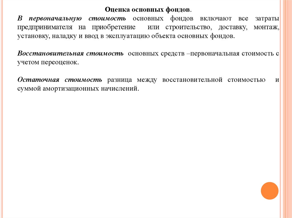 Оценка основных фондов.В первоначальную стоимость основных фондов включают все затраты