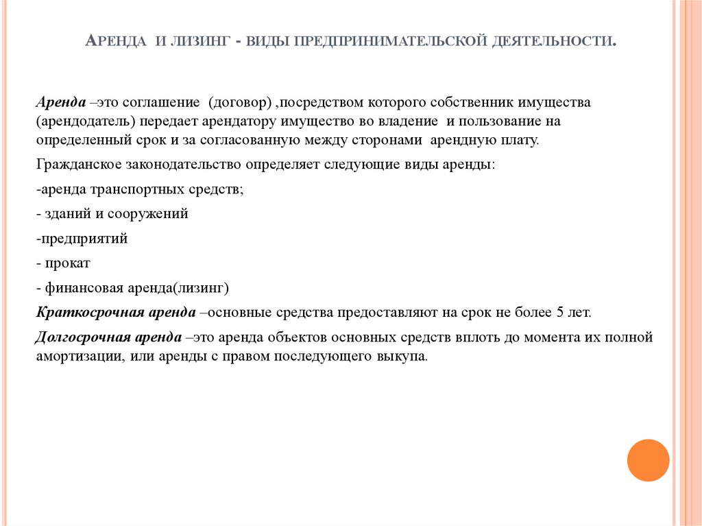 АРЕНДА И ЛИЗИНГ - ВИДЫ ПРЕДПРИНИМАТЕЛЬСКОЙ ДЕЯТЕЛЬНОСТИ.Аренда –это соглашение (договор) ,посредством которого собственник имущества