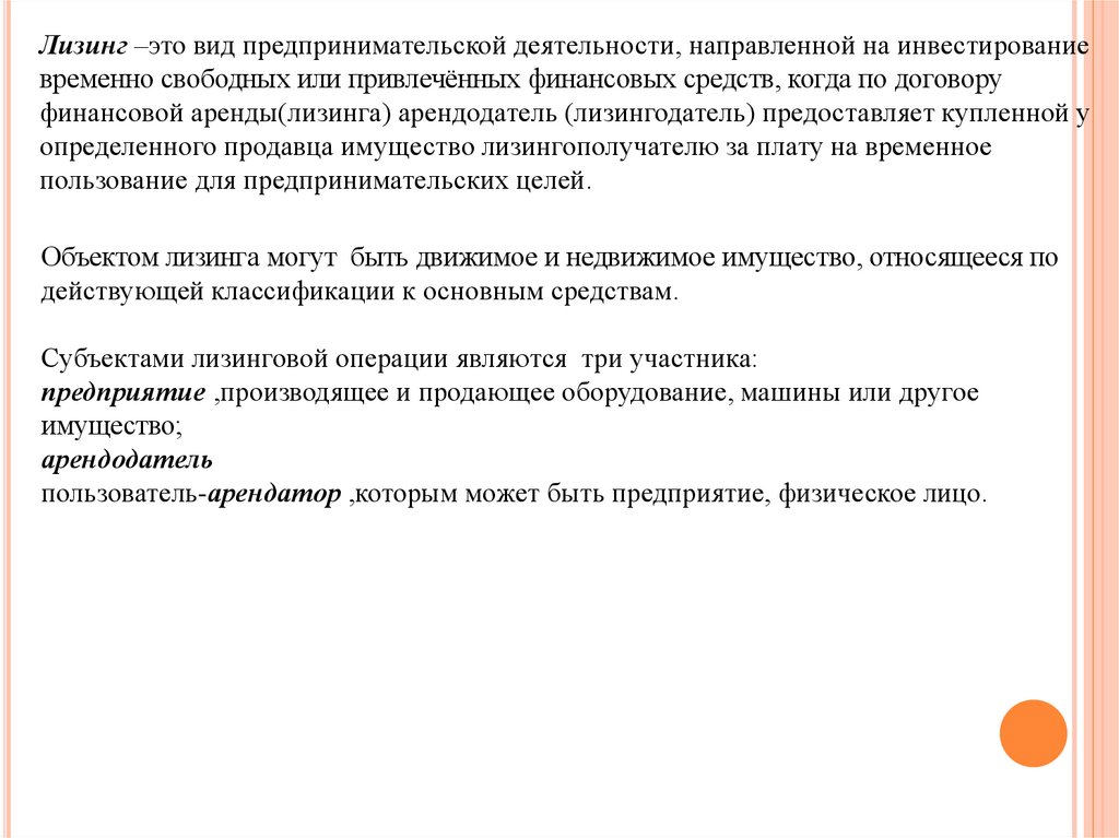 Лизинг –это вид предпринимательской деятельности, направленной на инвестированиевременно свободных или привлечённых финансовых средств, когда по договору