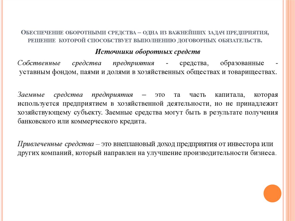 ОБЕСПЕЧЕНИЕ ОБОРОТНЫМИ СРЕДСТВА – ОДНА ИЗ ВАЖНЕЙШИХ ЗАДАЧ ПРЕДПРИЯТИЯ,РЕШЕНИЕ КОТОРОЙ СПОСОБСТВУЕТ ВЫПОЛНЕНИЮ ДОГОВОРНЫХ ОБЯЗАТЕЛЬСТВ.
