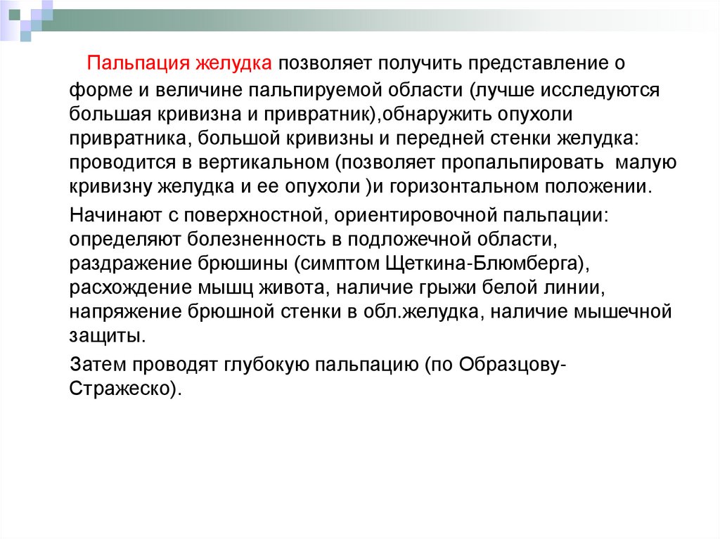 Пальпация желудка позволяет получить представление оформе и величине пальпируемой области (лучше исследуются