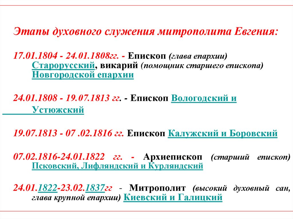 Этапы духовного служения митрополита Евгения:17.01.1804 - 24.01.1808гг. - Епископ (глава епархии)