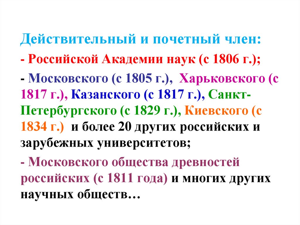 Действительный и почетный член:- Российской Академии наук (с 1806 г.);