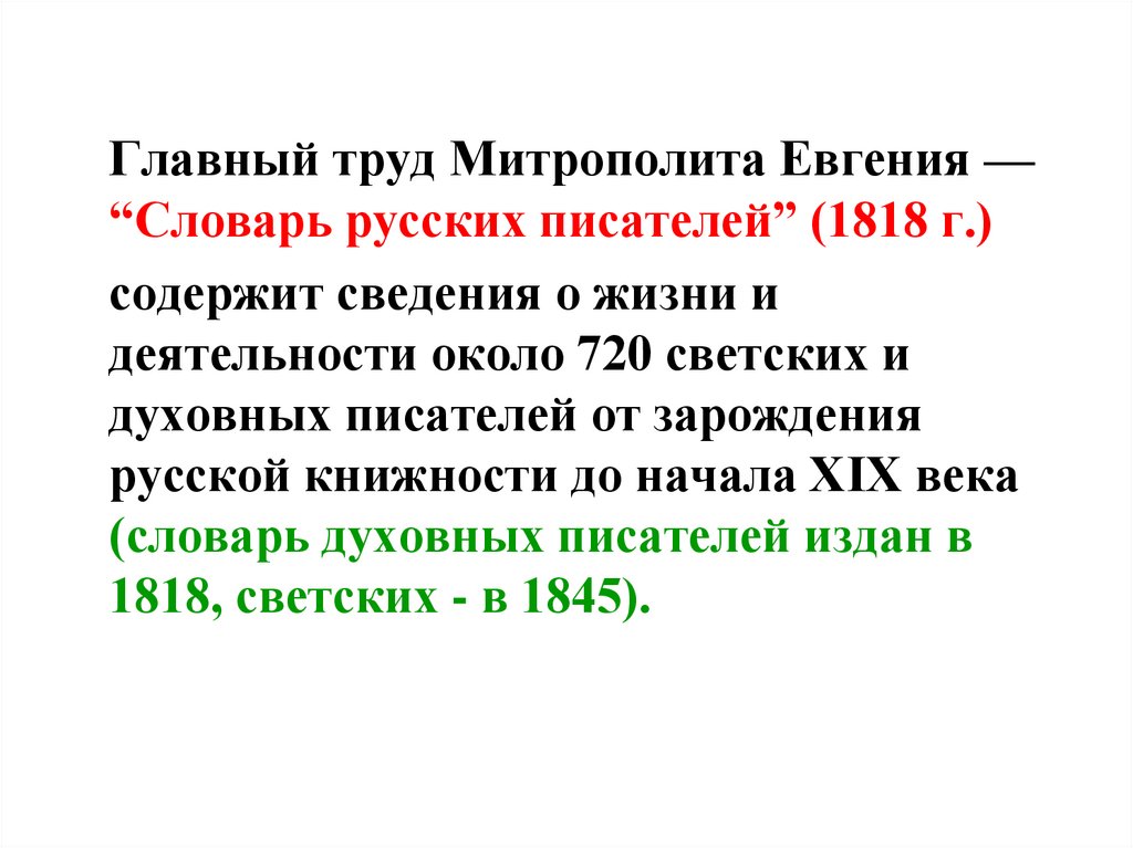 Главный труд Митрополита Евгения —“Словарь русских писателей” (1818 г.)