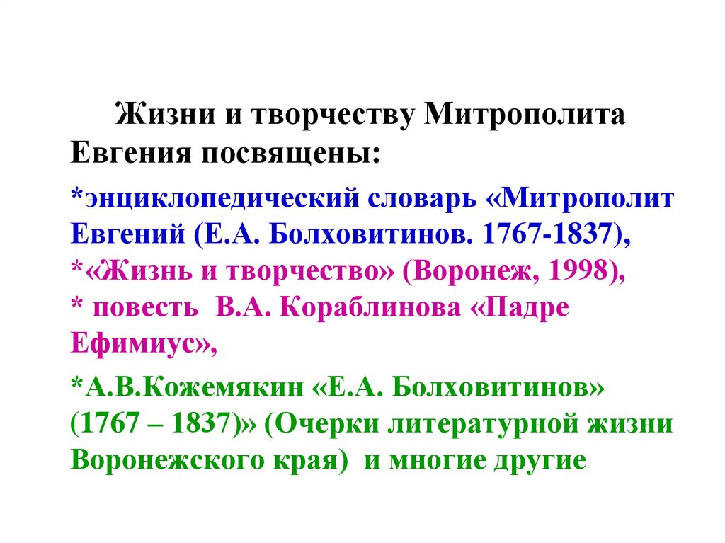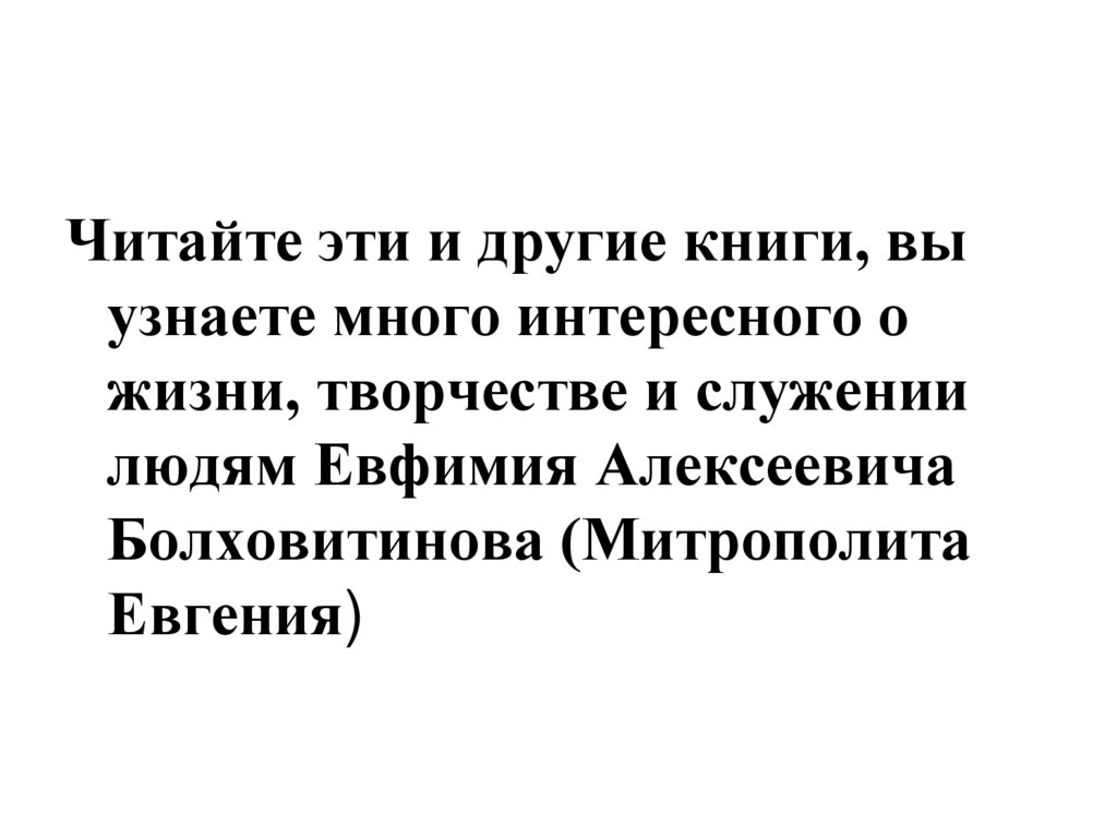 Жизни и творчеству МитрополитаЕвгения посвящены: