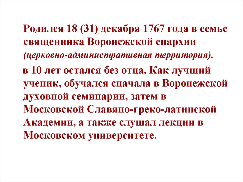 Родился 18 (31) декабря 1767 года в семьесвященника Воронежской епархии