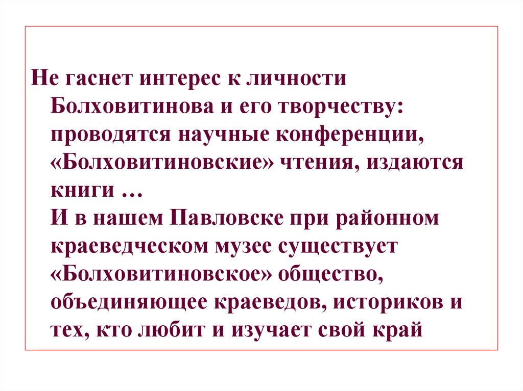 Не гаснет интерес к личностиБолховитинова и его творчеству: