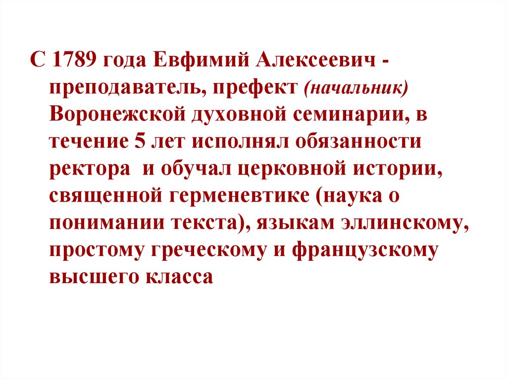 С 1789 года Евфимий Алексеевич преподаватель, префект (начальник)Воронежской духовной семинарии, в