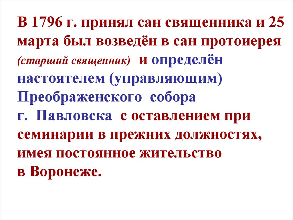 В 1796 г. принял сан священника и 25марта был возведён в сан протоиерея