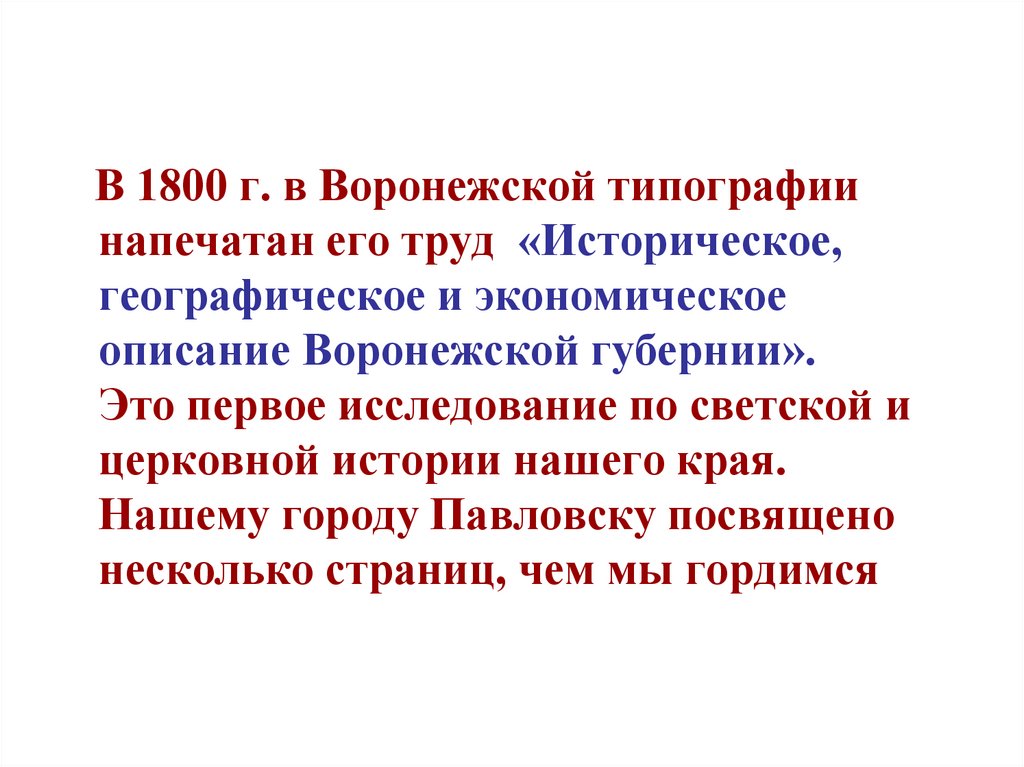 В 1800 г. в Воронежской типографиинапечатан его труд «Историческое,