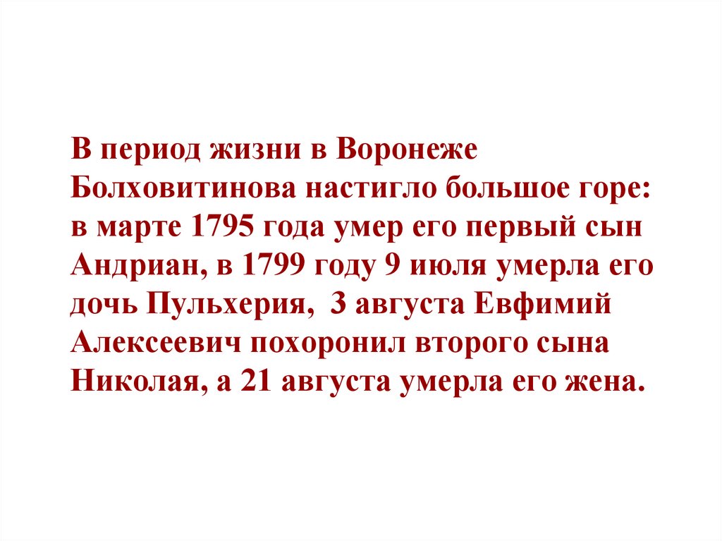 В период жизни в ВоронежеБолховитинова настигло большое горе: