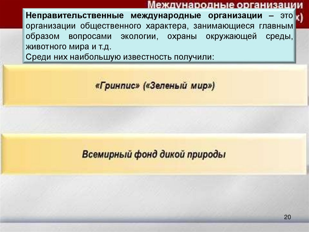 Неправительственные международные организации – этоорганизации общественного характера, занимающиеся главным