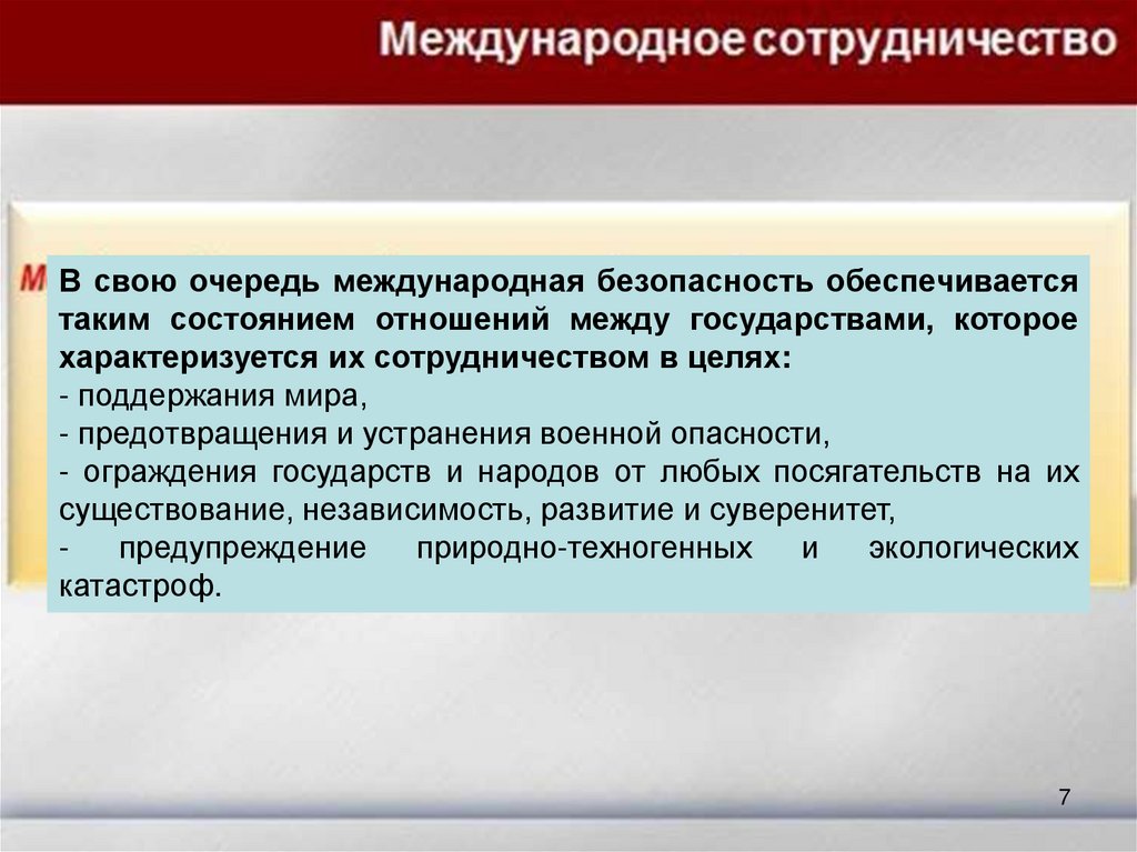 В свою очередь международная безопасность обеспечиваетсятаким состоянием отношений между государствами, которое