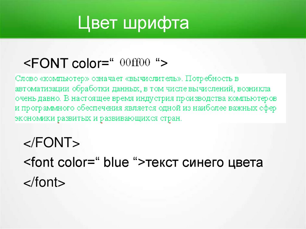 Цвет шрифта<FONT color=“