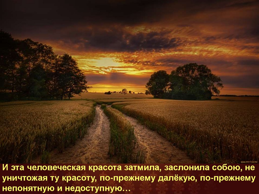 И эта человеческая красота затмила, заслонила собою, неуничтожая ту красоту, по-прежнему далёкую, по-прежнему