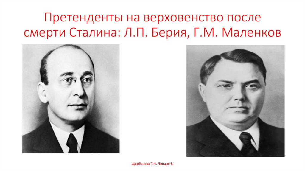 Претенденты на верховенство послесмерти Сталина: Л.П. Берия, Г.М. Маленков