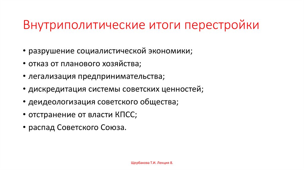Внутриполитические итоги перестройки• разрушение социалистической экономики;