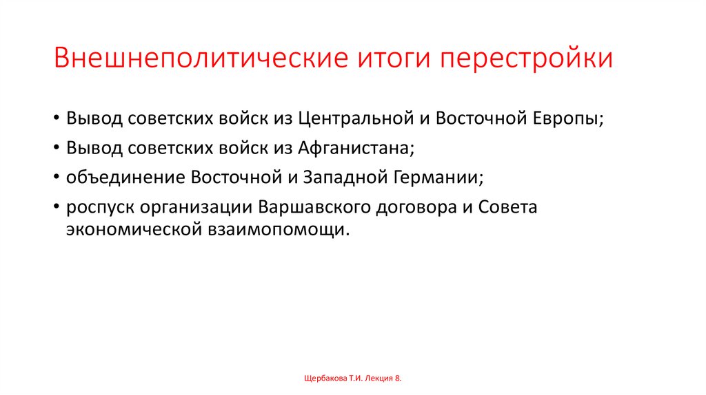 Внешнеполитические итоги перестройки• Вывод советских войск из Центральной и Восточной Европы;