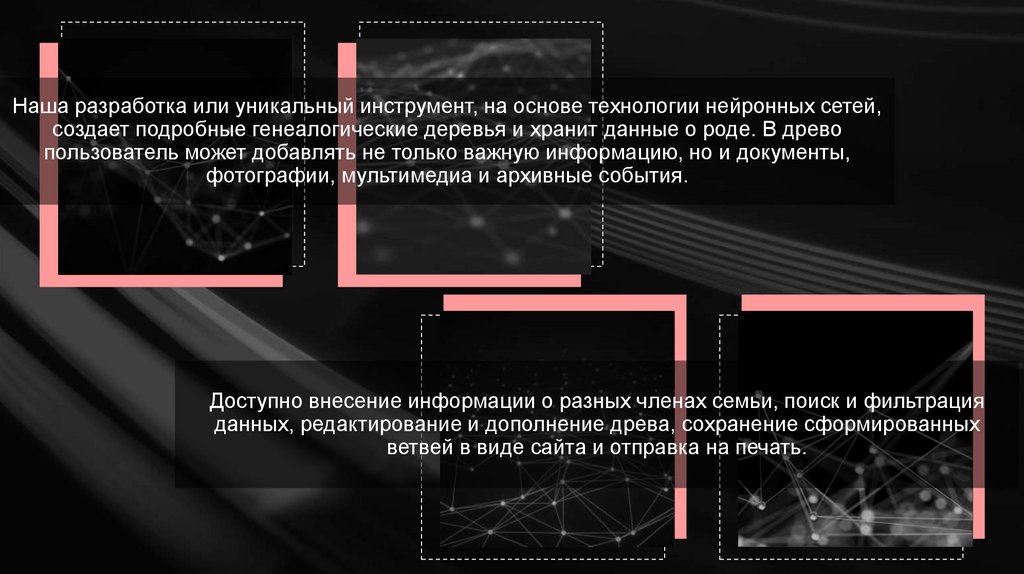 Наша разработка или уникальный инструмент, на основе технологии нейронных сетей,создает подробные генеалогические деревья и хранит данные о роде. В древо