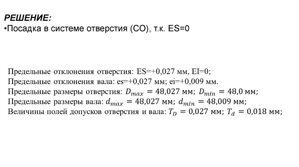 РЕШЕНИЕ:•Посадка в системе отверстия (СО), т.к. ES=0