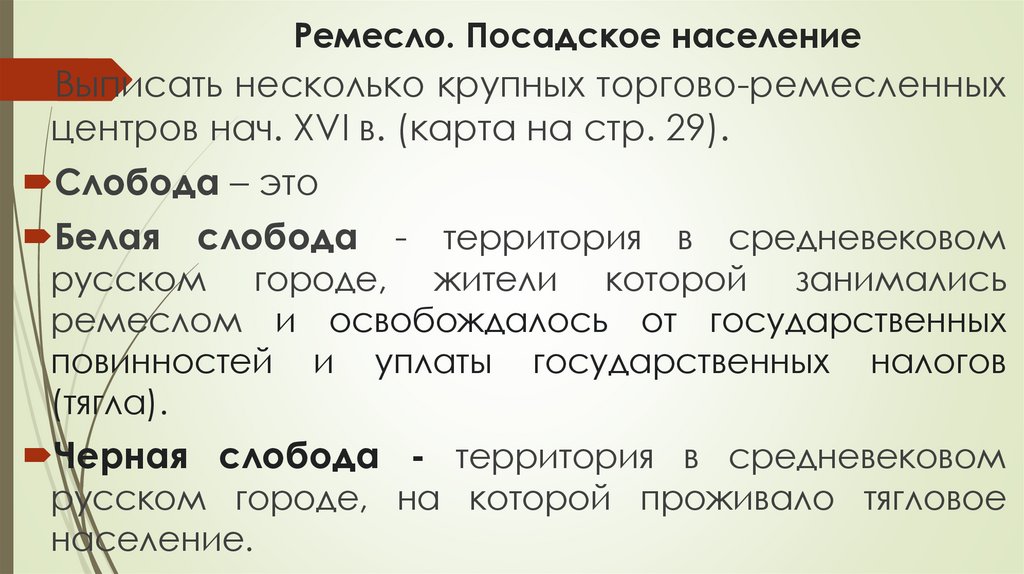 Ремесло. Посадское населениеВыписать несколько крупных торгово-ремесленных