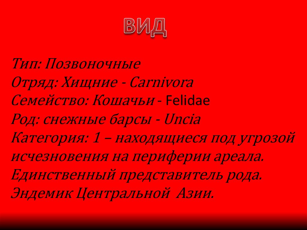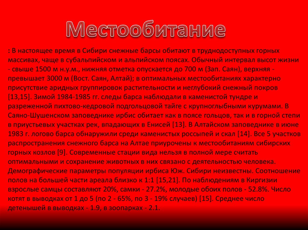 : В настоящее время в Сибири снежные барсы обитают в труднодоступных горныхмассивах, чаще в субальпийском и альпийском поясах. Обычный интервал высот жизни