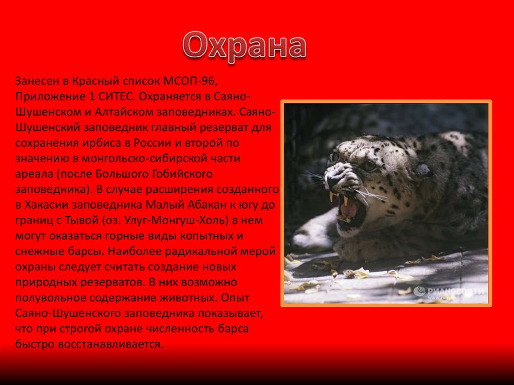 Занесен в Красный список МСОП-96,Приложение 1 СИТЕС. Охраняется в СаяноШушенском и Алтайском заповедниках. СаяноШушенский заповедник главный резерват для