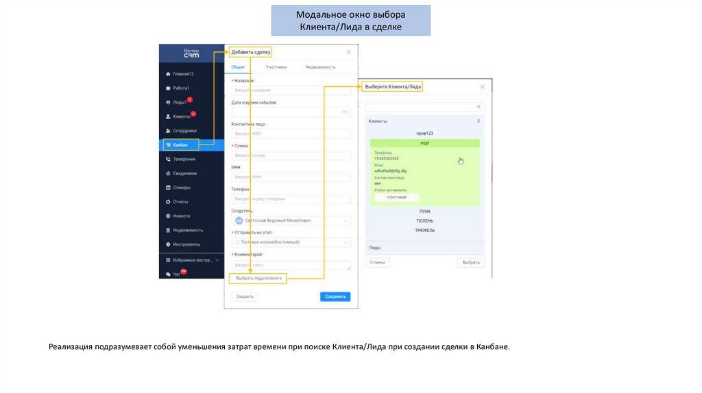 Реализация подразумевает собой уменьшения затрат времени при поиске Клиента/Лида при создании сделки в Канбане.
