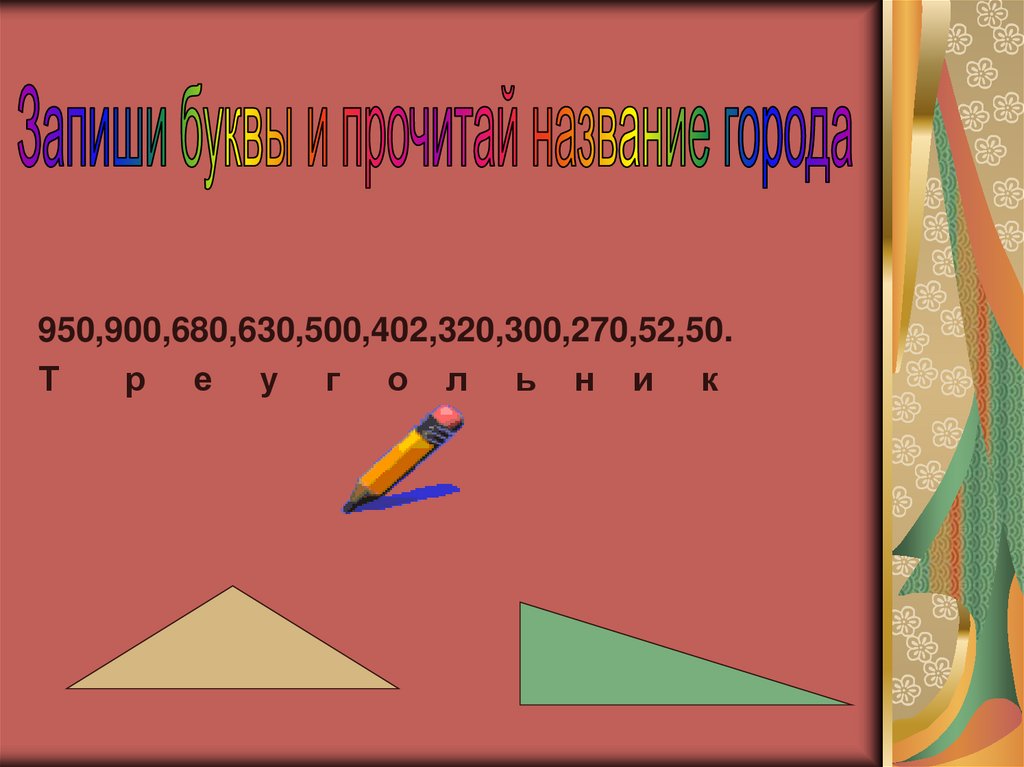 Страна Геометрия3. МАТЕМАТИЧЕСКИЙ ДИКТАНТ 290 +10 (ь) 250 + 700 (т) 860 +40 (р) 450 + 50 (г) 920 – 600 (л) 720 – 40 (е) 560 + 70 (у) 470 – 200 (н)