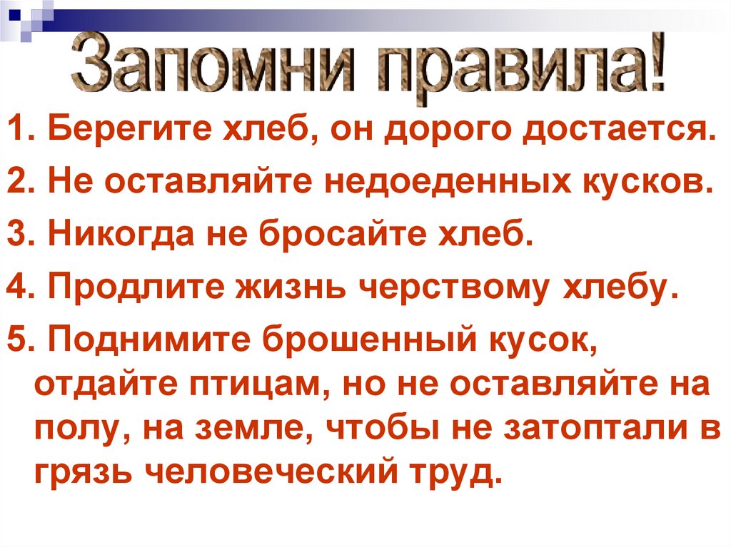 1. Берегите хлеб, он дорого достается.2. Не оставляйте недоеденных кусков.