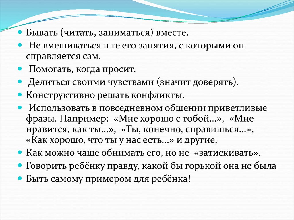 Бывать (читать, заниматься) вместе.Не вмешиваться в те его занятия, с которыми он