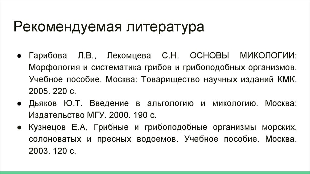 Рекомендуемая литература● Гарибова Л.В., Лекомцева С.Н. ОСНОВЫ МИКОЛОГИИ: