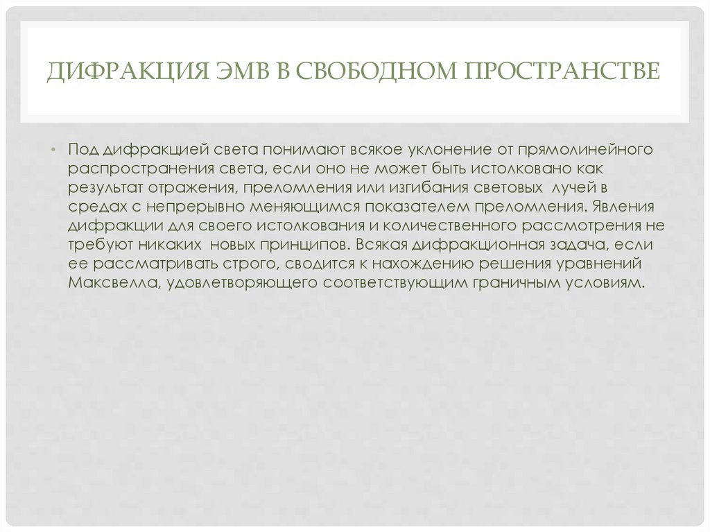 ДИФРАКЦИЯ ЭМВ В СВОБОДНОМ ПРОСТРАНСТВЕ• Под дифракцией света понимают всякое уклонение от прямолинейного