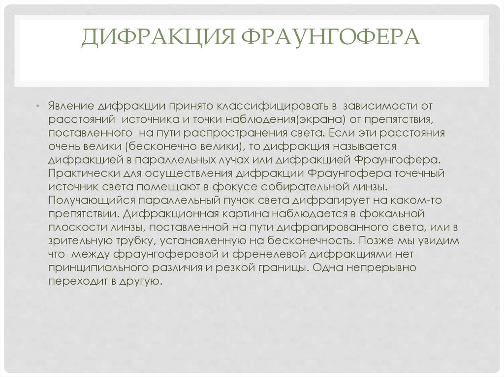 ДИФРАКЦИЯ ФРАУНГОФЕРА• Явление дифракции принято классифицировать в зависимости от