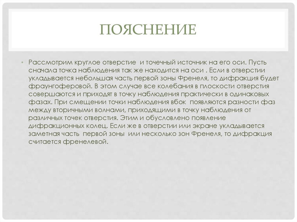 ПОЯСНЕНИЕ• Рассмотрим круглое отверстие и точечный источник на его оси. Пусть