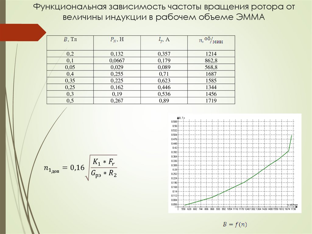 Функциональная зависимость частоты вращения ротора отвеличины индукции в рабочем объеме ЭММА