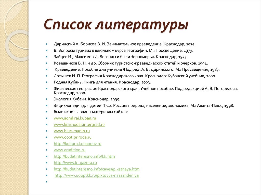 Список литературыДаринский А. Борисов В. И. Занимательное краеведение. Краснодар, 1975.