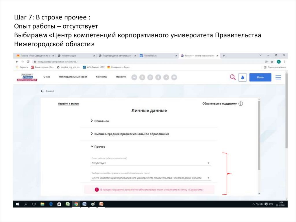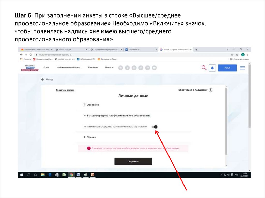 Шаг 6: При заполнении анкеты в строке «Высшее/среднеепрофессиональное образование» Необходимо «Включить» значок,