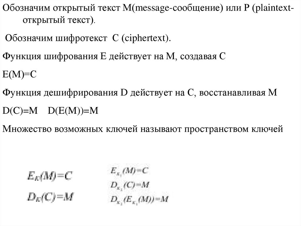 Обозначим открытый текст М(message-сообщение) или Р (plaintextоткрытый текст).Обозначим шифротекст С (ciphertext).