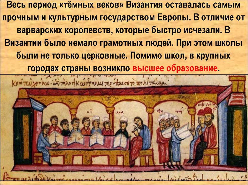 Весь период «тёмных веков» Византия оставалась самымпрочным и культурным государством Европы. В отличие от